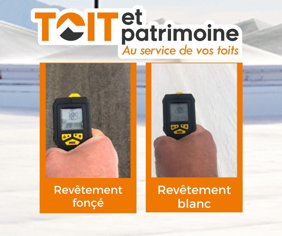 En comparaison avec un revêtement de toiture noir, le revêtement de toiture blanc permet de gagner jusqu’à 40°C en surface et 5°c à l’intérieur du bâtiment, ce qui est non négligeable !